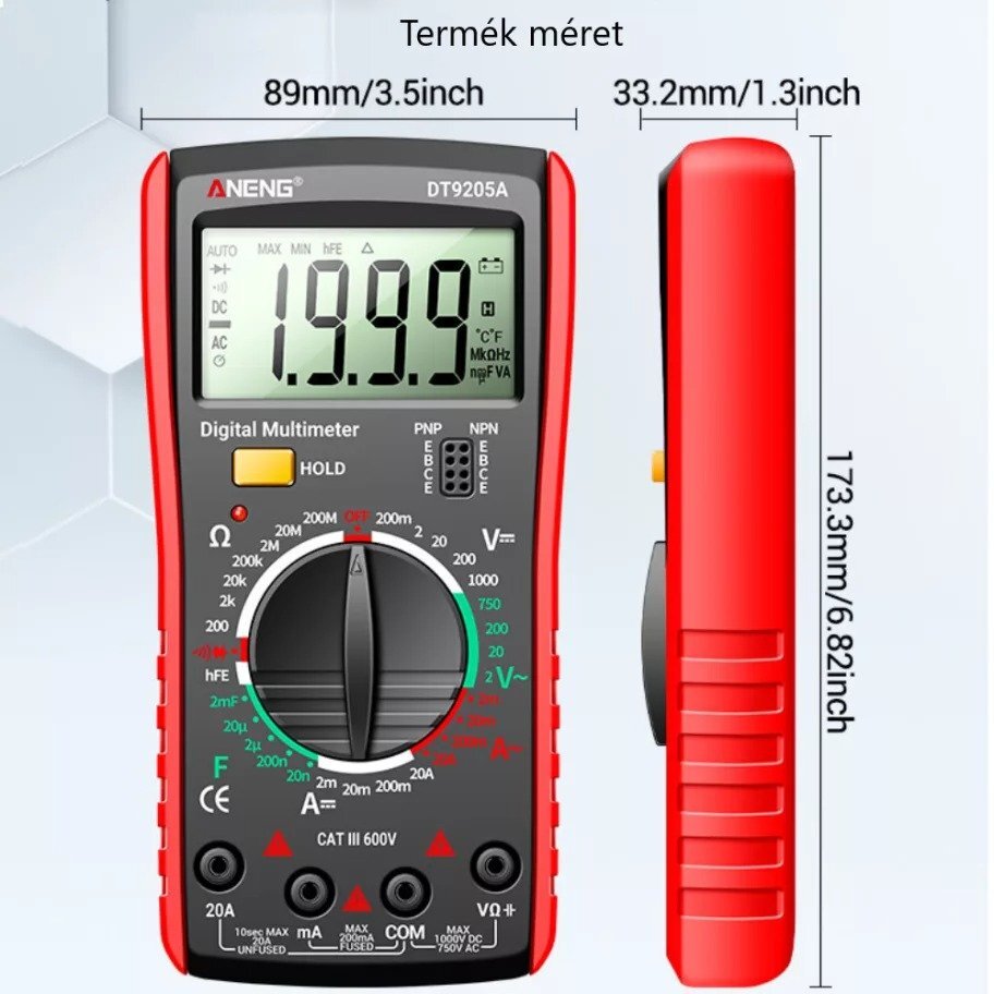 Az ANENG DT9205A Digitális Multiméter villanyszerelők, műszerészek vagy barkácsolók tökéletes segítője, hiszen egy lenyűgöző mérőeszköz. Mérések tárházát tartalmazza, és bármilyen munkakörnyezetben és fényviszonyban egyszerűen használható. Azoknak javasoljuk, akik egy megbízható multimétert keresnek háztartásukba vagy munkájukhoz, akár fáziskereséshez, fúrás, barkácsolás előkészítéséhez egyaránt.