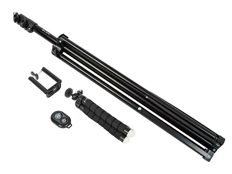 A készlet két állványt tartalmaz: egy masszív alumínium, 210 cm magas háromlábút és egy rugalmas, hajlítható miniállványt, amely bármilyen felülethez igazítható - fára, korlátra, csőre vagy padra is rögzíthető.