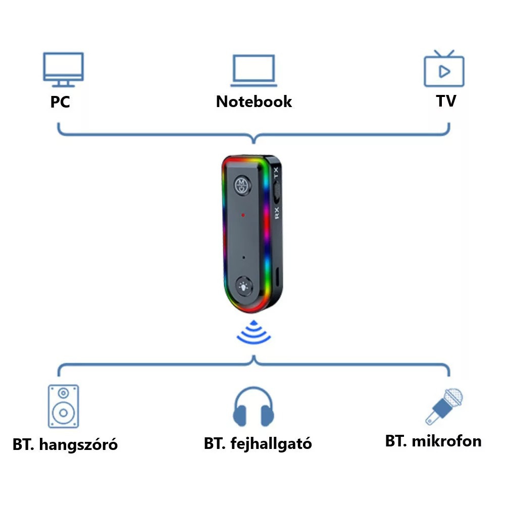 Kétirányú jelátvitelt biztosít (TX/RX), így Bluetooth vevőként és jeladóként is funkcionál.