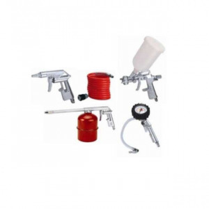 Széleskörű barkács és autós felhasználás a kerékfújástól a festékszóráson át a lakkozásig, tartalma festékszórópisztoly gravitációs tartállyal, gázolajszóró pisztoly , lefúvató pisztoly, manométeres kerékfúvató pisztoly és 5 m-es pneumatika spirál tömlő