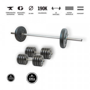 Univerzális, több készlet készíthető. A tárcsákat le-fel tudja helyezni a súlyzó rúdon.
