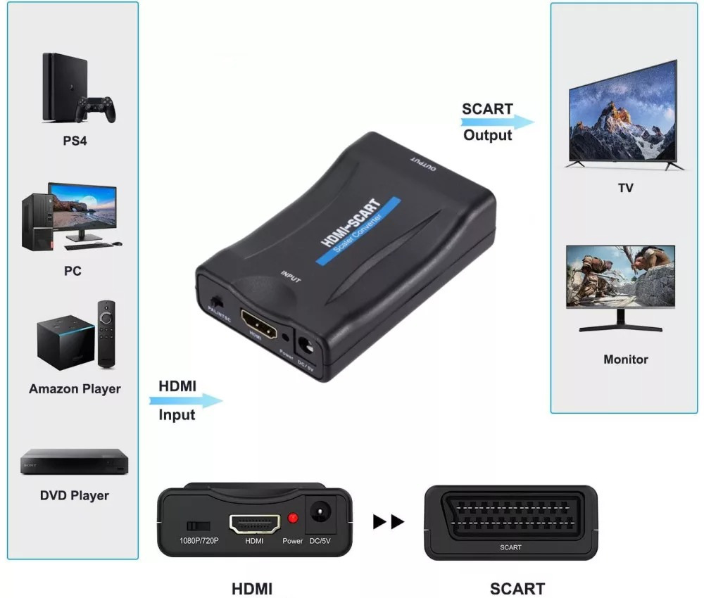 Kompatibilitás: Kompatibilis a HDMI kimenettel rendelkező eszközökkel, beleértve a laptopokat, játék konzolokat, újabb lejátszókat, TV Boxokat. Emellett kompatibilis az összes Scart csatlakozós kijelzővel. Például regi televíziókkal és egyéb scart csatlakozós kijelzőkkel.
