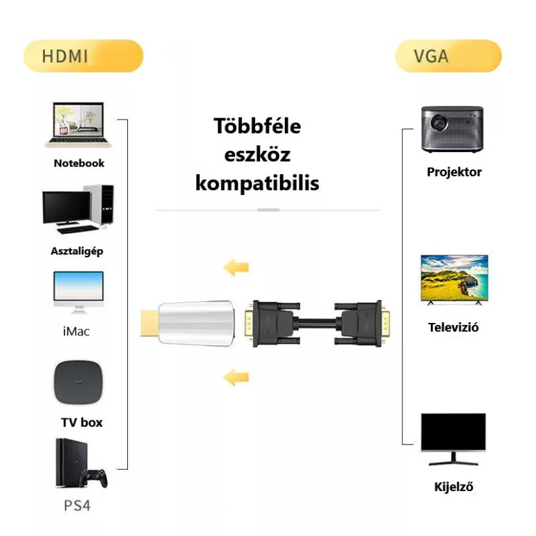 Ez egy HDMI->VGA+Jack átalakító adapter lehetővé teszi a digitális multimédiás adatok átvitelét egy HDMI-porttal rendelkező eszközről egy VGA-porttal rendelkező kijelzőre, valamint jack csatlakozóval rendelkező hangszóróra is.