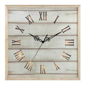 Beltéri kivitel\nrómai számokkal\n12 db melegfehér LED\nOFF/ON (6h ON / 18h OFF) ismétlődő háttérvilágítás-időzítés\ntápellátás: 2 x AAA, 1 x AA (1,5 V) elem, nem tartozék\méret: 31 x 31 x 3,5 cm