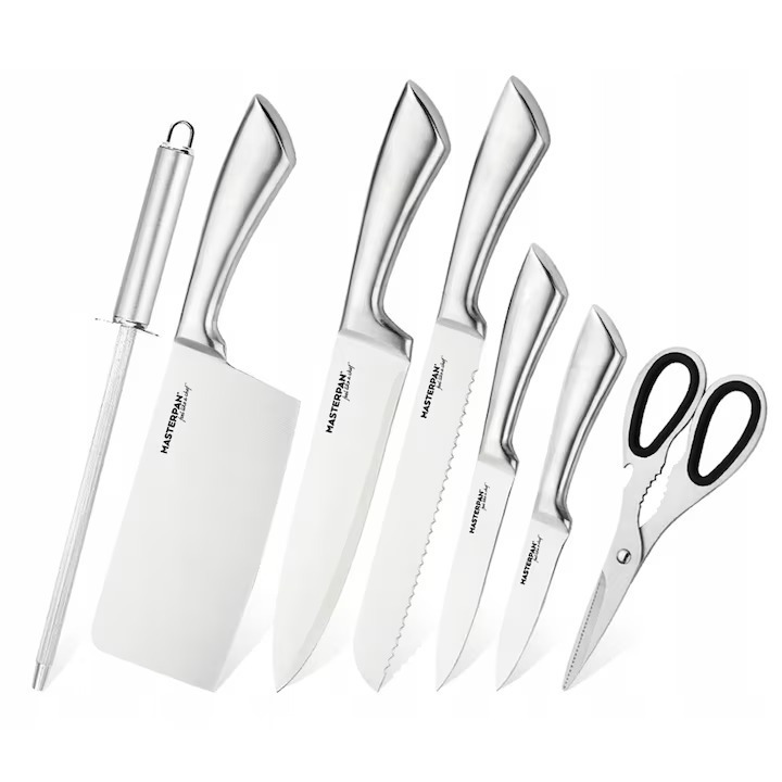 Kések típusai - szakácskés (8"), kenyérvágó kés (8"), szeletelőkés (8"), használati kés (5"), vágókés (3,5")