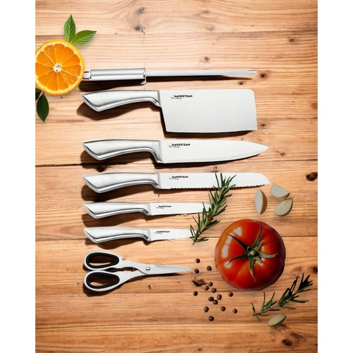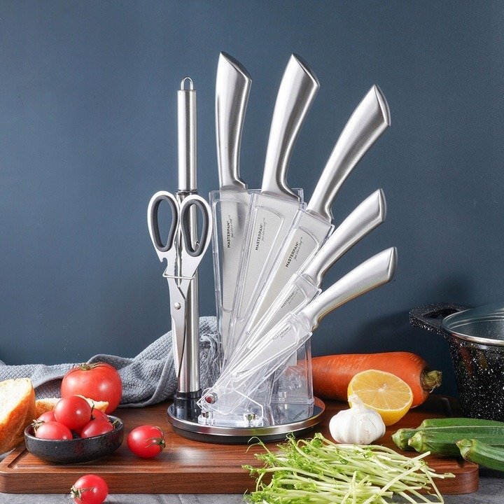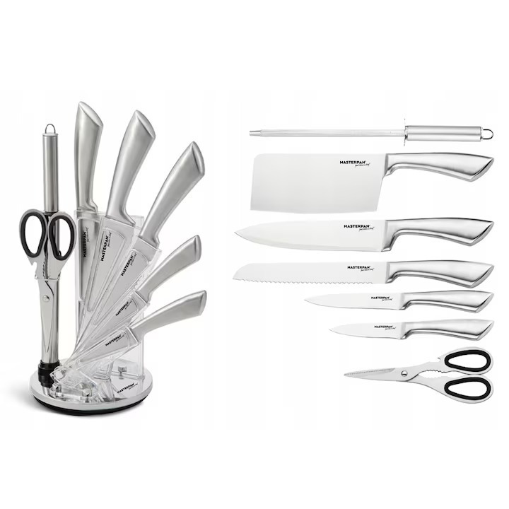 9 részes készlet - 6 kés, 3 konyhai szerszám, állvány