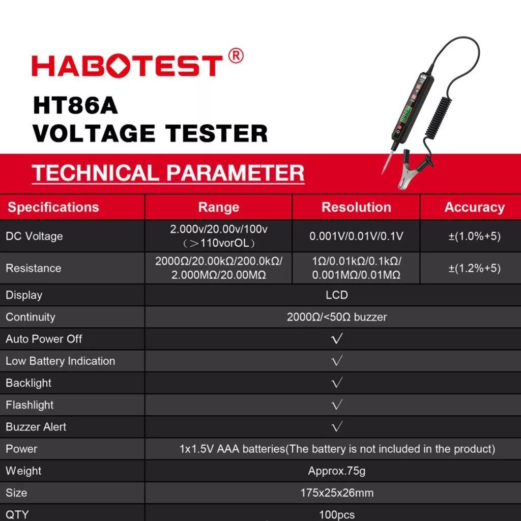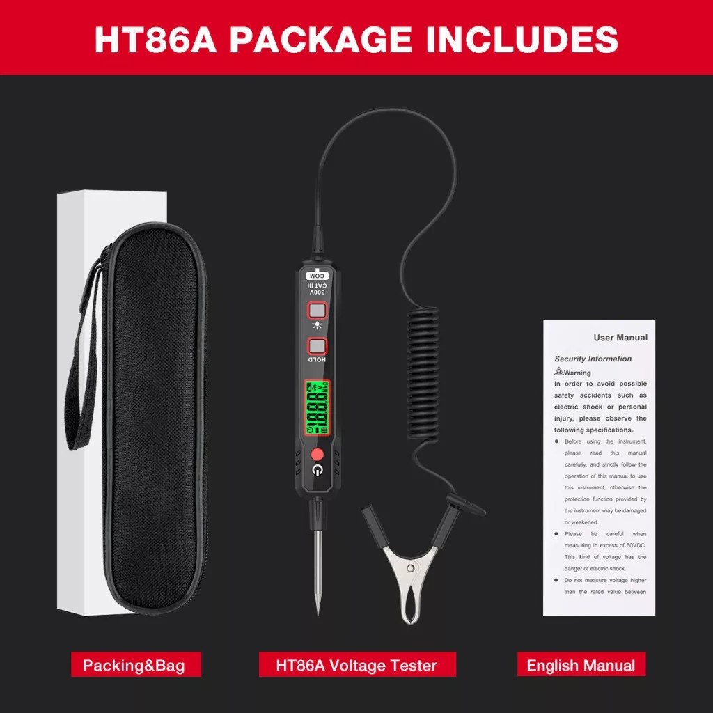 A HT86A Multifunkciós Autós Feszültség Áramkör-teszter egy igen pontos hordozható mérőberendezés, ami kompakt méretével és hordozható kialakításával kis helyen elfér. Funkciók széles választékával rendelkezik, ide értve a feszültség, ellenállás és folytonosság mérést. Hatalmas segítséget nyújt a gépjárművek ellenőrzéséhez, és a hibás biztosítékok vagy áramkörök felderítéséhez.