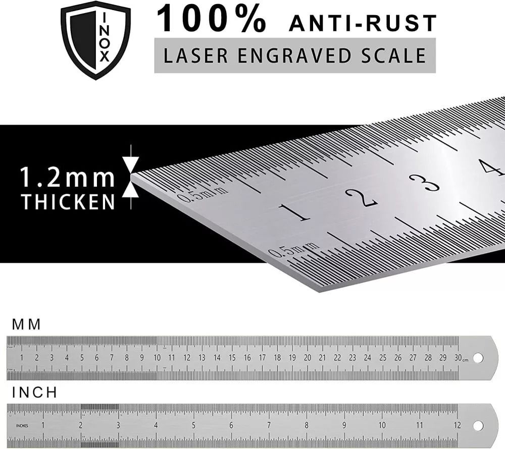 A vonalzót a másik lapjára fordítva inchben is végezhet méréseket. Mérési pontossága 0,5 mm vagy 1/64 inch.