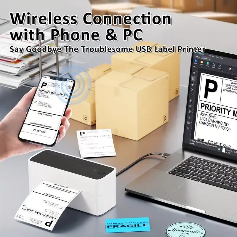 A Phomemo vezeték nélküli hőcímke nyomtató tökéletes választás webshopok, kisvállalkozások és otthoni csomagolási feladatok számára. A 10,16 × 15,24 cm-es (4x6 hüvelykes) címkeméret ideális szállítási és termékcímkék nyomtatásához, gyorsan és tisztán - tintapatron nélkül.
