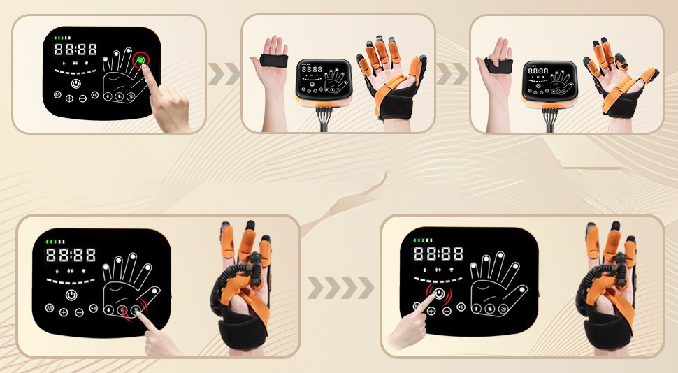 Komplex ujjtréning: A kesztyű ötujjas rotációs edzést, szekvenciális húzótréninget, izomfeszülés-csökkentést és tükrözéses tréning funkciót kínál, így mindkét kéz mozgása összehangolható.