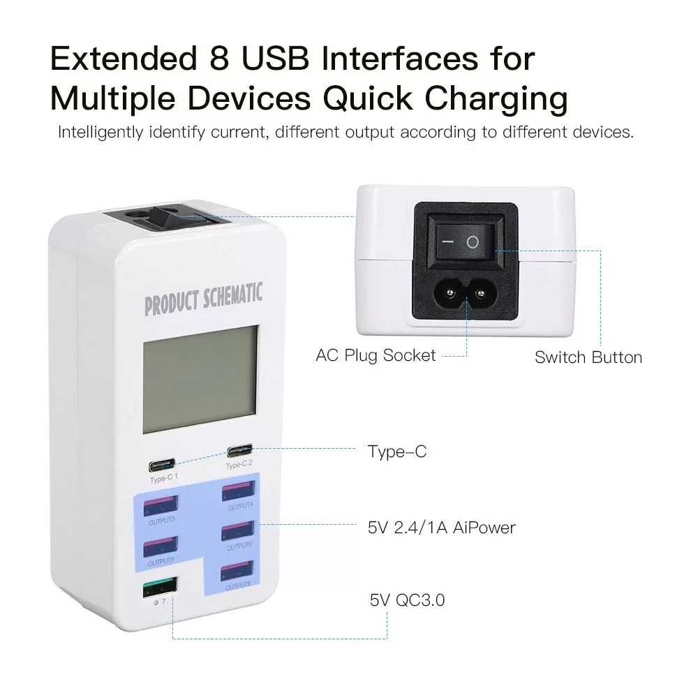 A 8db USB-A töltő porttal akár 8 eszközt is tölthet egyszerre. Kompakt mérettel rendelkezik, így könnyen hordozható. Fejlett védelmet biztosít az elektromos szivárgás, rövidzárlat, túlmelegedés, bemeneti és kimeneti túlfeszültség, valamint a kimenet túláram ellen is egyaránt.
